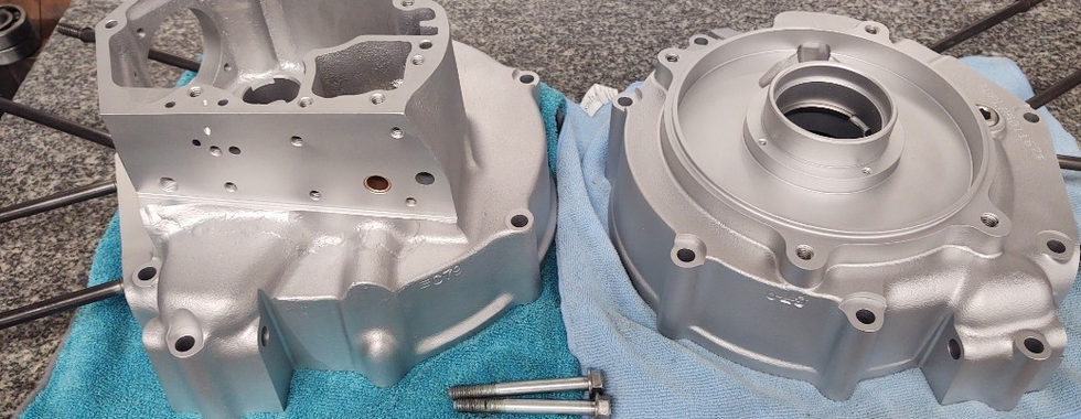 This is a set of Harley Evo cases. Of course the black factory paint is how it arrived to me. The chalky gray is after sand blasting with Garnet media and the nice shiny silver is after vapor honing.